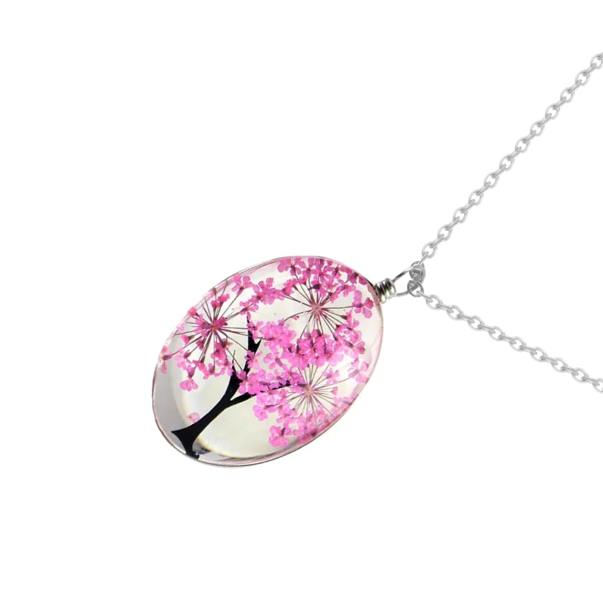 Detalles: Hermoso Dije de Árbol con Flores Naturales Rosa y Collar de Acero Inoxidable.